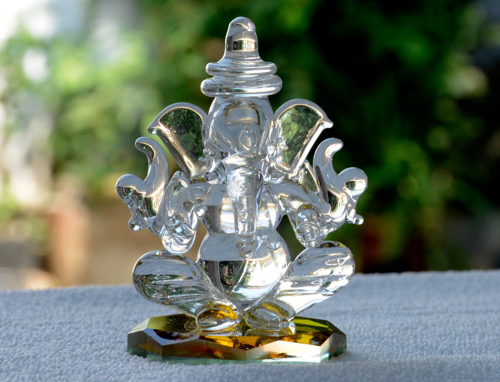 The double-sided glass Ganesha Ji idol is a unique and artistic object, blending traditional religious symbolism with contemporary design. The clear glass construction creates a sense of purity and transparency, while the double-sided design offers a novel perspective on the representation of Ganesha. The faceted base adds a touch of elegance and visual interest.