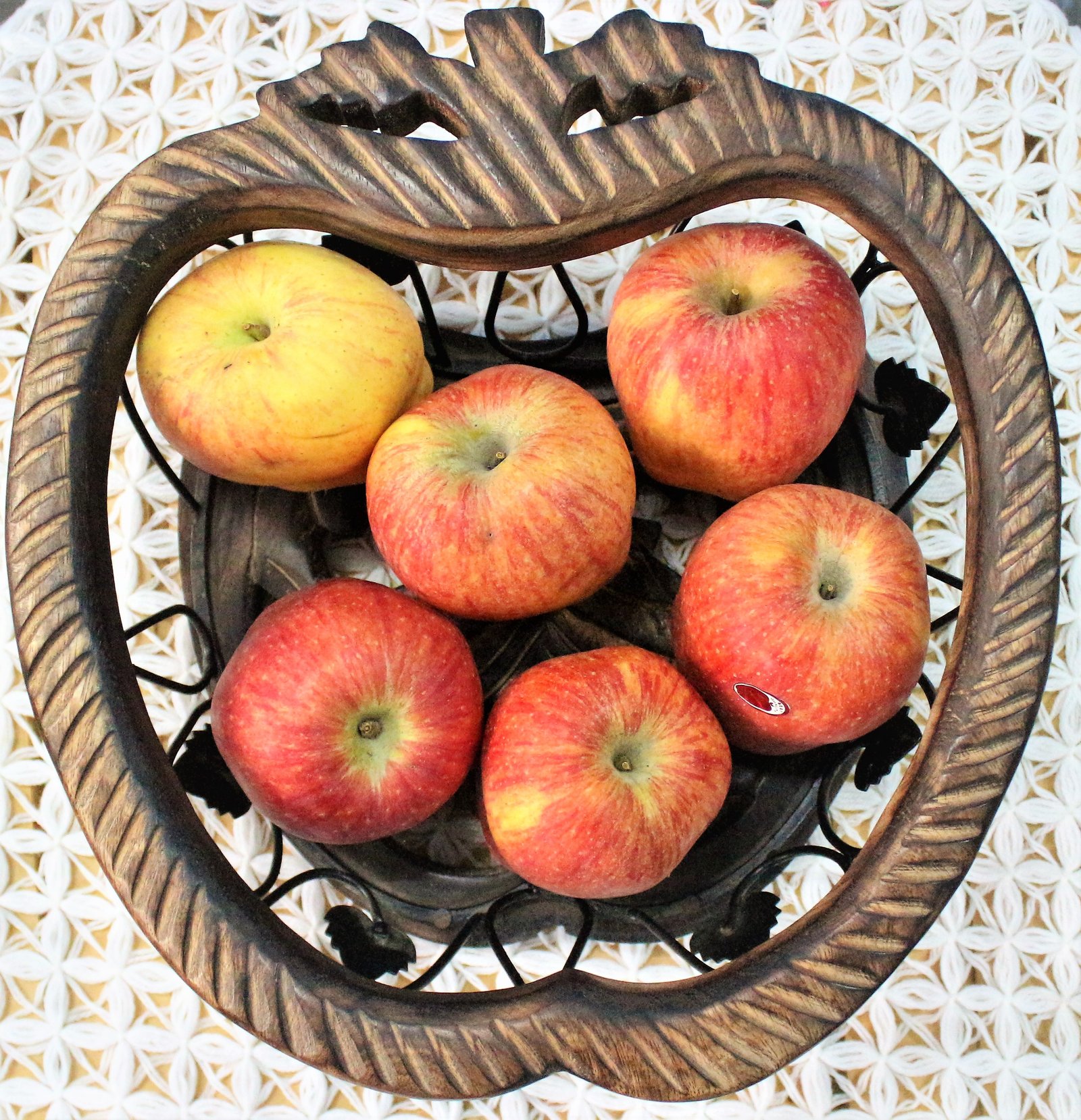 The basket appears to be a handcrafted piece, combining rustic charm with functional design. It's likely intended for holding fruits or vegetables, adding a decorative touch to a kitchen or dining area. The combination of wood and wrought iron gives it a sturdy and durable feel, while the intricate carvings and leaf details add a touch of artistry. The dark stain suggests a traditional or vintage aesthetic.